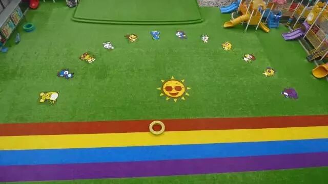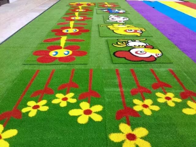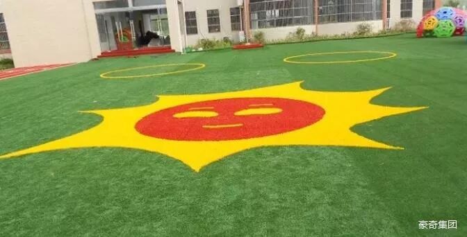 彩色图案在幼儿园草坪体系中主要用于美化和点缀,进一步增加场地的活泼型和生动性,将多彩多姿的卡通融入草坪,营造了童话般意境。更可将幼儿园的名称、LOGO、广告语植入场地,更显个性和档次。图案通常有两种做法